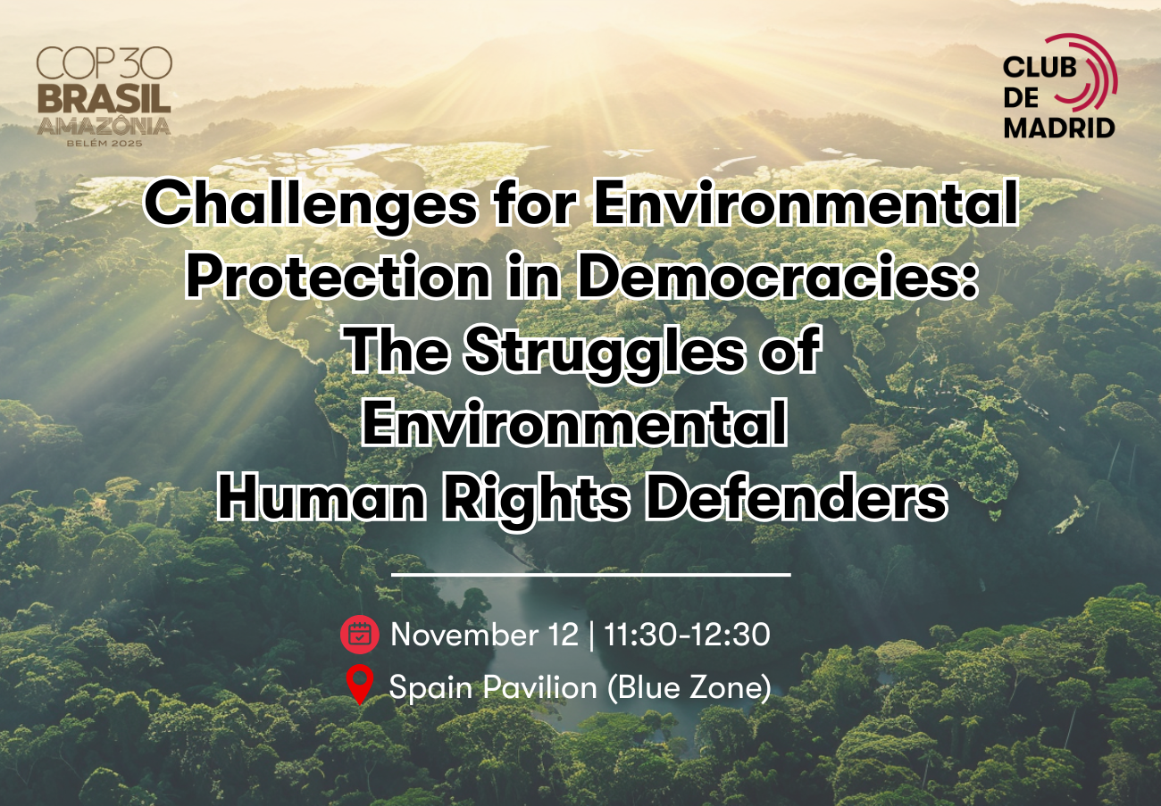 Organized by Club de Madrid, this session explores how democracies can better protect defenders and promote gender-responsive, collaborative environmental action through initiatives like LEAD, Escazú, and Aarhus.